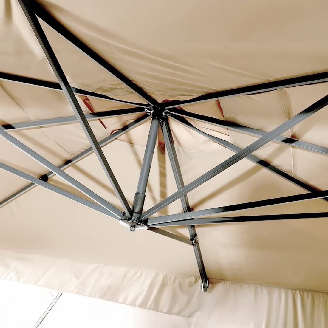 Il suo tendone rettangolare da tre metri per quattro metri ti consentirà di poterlo utilizzare sia per proteggere un tavolo e così poter pranzare all'esterno al riparo dalla calura, sia di potervi collocare poltrone e sedie a sdraio per potersi rilassare al fresco. Il braccio decentrato consente di recuperare spazio e di poter occupare tutta la sua zona d'ombra senza alcun intralcio, ottenendo così una superficie totalmente sfruttabile.